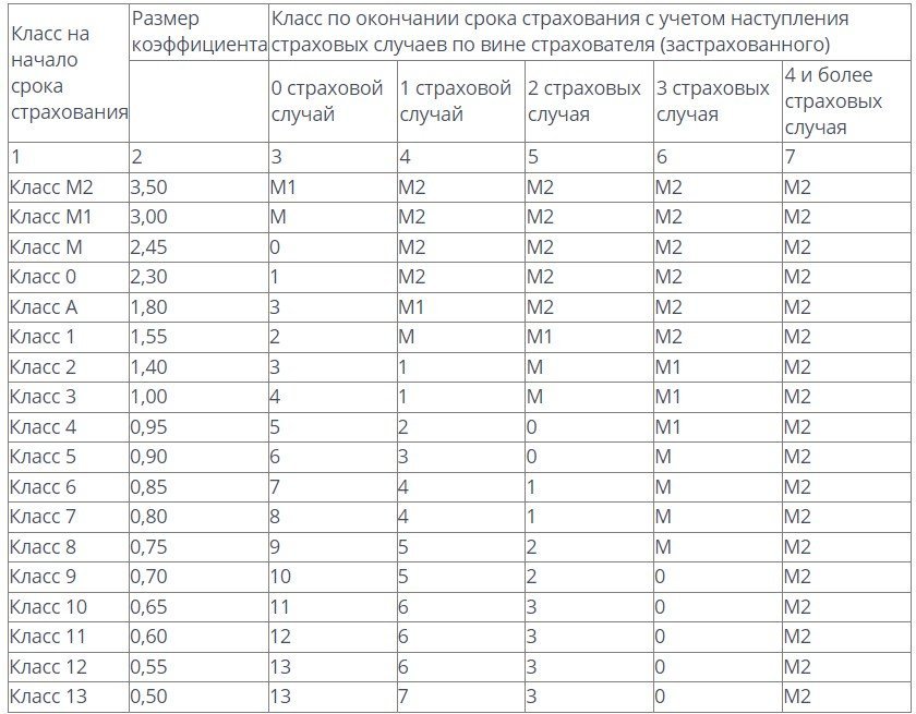 Заң жобасында барлығы 18 сақтандыру класы бар. Төменгі кластар жол қозғалысы ережелерін жиі бұзатын жүргізушілерге арналады. М2, М1 және М, одан жоғары нөлдік класс болады. Одан әрі А класы және он үш негізгі класс бар. Класс неғұрлым төмен болса, сақтандыру үшін соғұрлым көп төлеуге тура келеді. Әрбірінің сақтандыру шарттарын кестеден қараңыз: