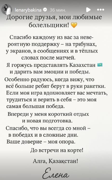«Қымбатты достар, сүйікті жанкүйерлерім! Стадионда, экран алдында, хаттарыңыз бен жылы сөздеріңіз арқылы білдірген қолдауларыңыз үшін әрқайсыңызға шын жүректен алғыс айтамын. Мен Қазақстан атынан өнер көрсетіп, сіздерге қуаныш пен жеңіс сыйлай алғаныма мақтанамын. Әсіресе, барған сайын көбірек жастардың қолына ракетка алып жатқанын көргенде ерекше қуанышқа бөленемін. Егер менің ойыным сіздерді армандауға, еңбектенуге және өз-өзіңізге сенуге шабыттандырса, бұл менің ең үлкен жеңісім. Алда аздап демалыс пен жаңа дайындық күтіп тұр. Жеңіске жеткен сәттерде де, қиын күндерде де менімен бірге болғандарыңыз үшін рақмет. Сіздердің сенімдеріңіз — менің тірегім. Алаңда кездескенше! Алға, Қазақстан!» деп жазды спортшы Instagram парақшасында.