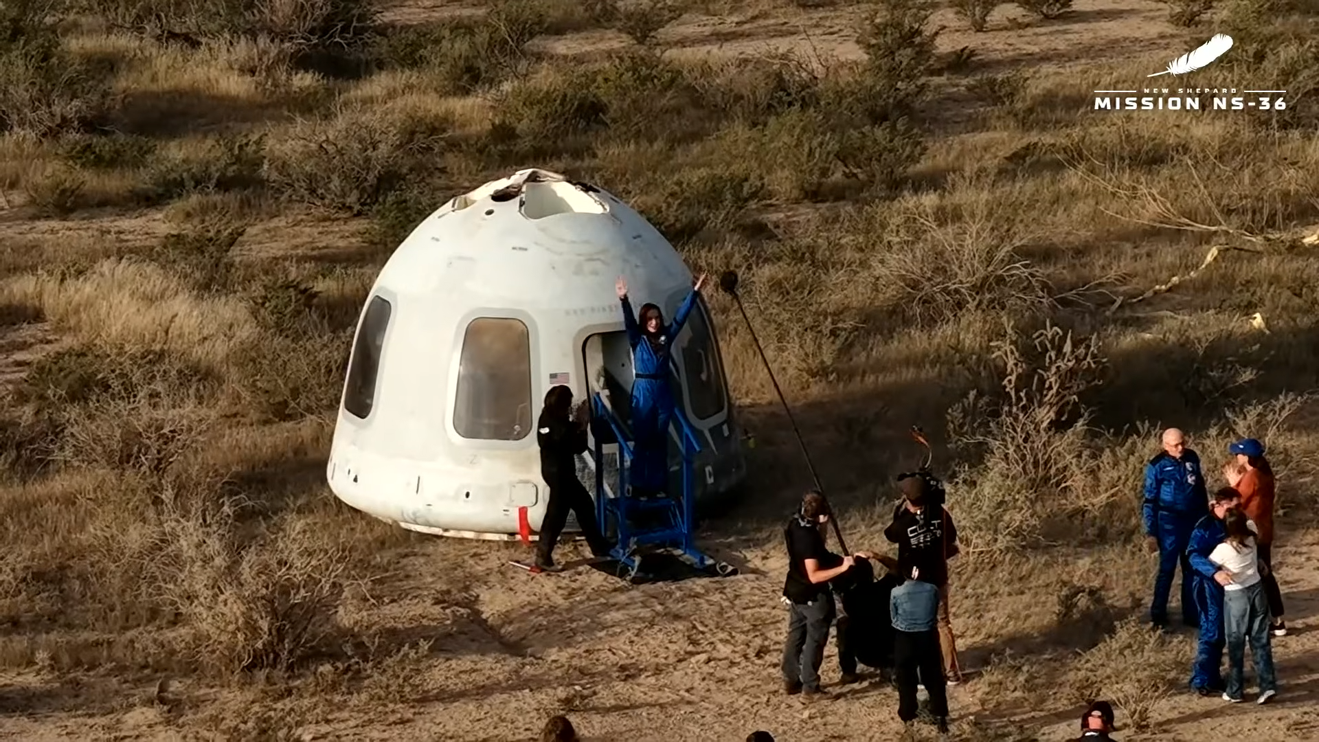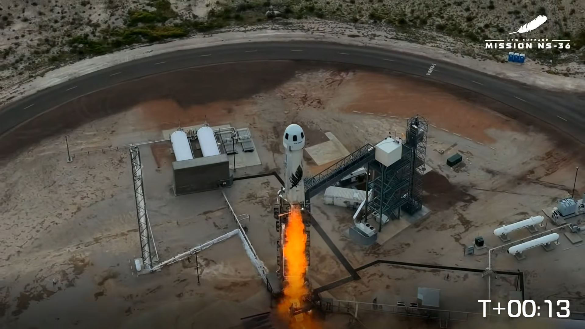 Компания «астронавтар ауылында» дайындық кадрлары мен зымыранның ұшу сәтін көрсетті. New Shepard NS-36 зымыранының ұшуы Астана уақытымен сағат 18:41-де Техас штатындағы Launch Site One алаңында болды. Ғарышқа ұшпас бұрын команда соңғы рұқсат пен жаттығулардан өтті. Барлық ұшақ мүшелері New Shepard капсуласына отырмас бұрын салтанатты қоңырау соқты. Бұл Blue Origin-дің символдық рәсімі, теңіз және авиация дәстүрлеріне сияқты миссияның соңғы кезеңінің басталғанын, уақытша қоштасу мен тікелей ұшуға шығу сәтін білдіреді.