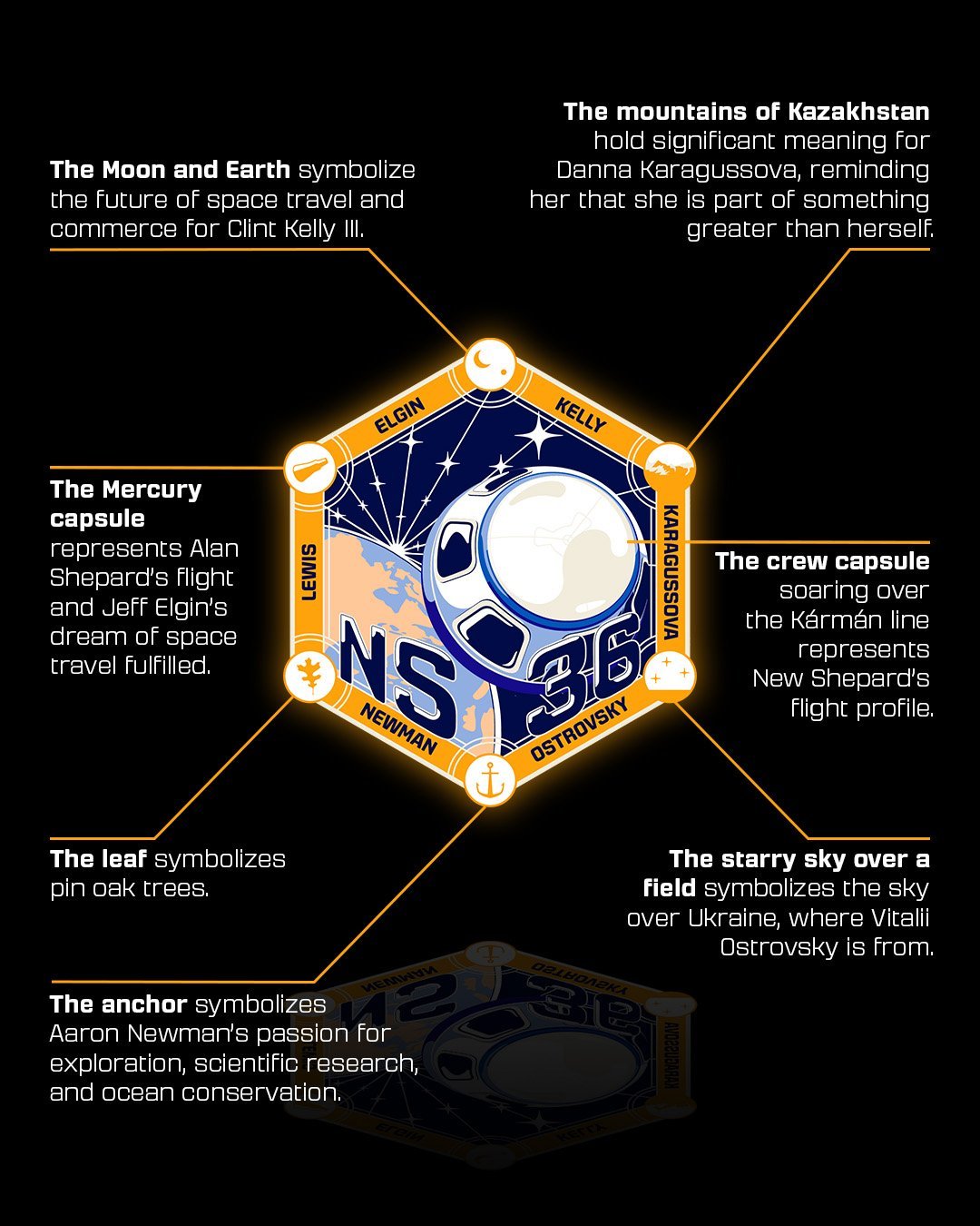 Ұшуға дейін Blue Origin NS-36 экипаж эмблемасымен таныстырды, оның әрбір элементі экипаж мүшелерінің жеке тарихын және ұшу аймағын бейнелейді.