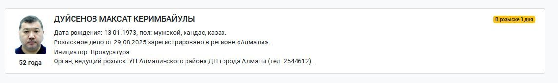 Қазақстанның бұрынғы Бас көлік прокуроры Мақсат Дүйсенов үш күннен бері іздеуде жүр. Бұл туралы ақпарат құқықтық статистика комитетінің базасында жарияланды, деп хабарлайды Orda.kz.