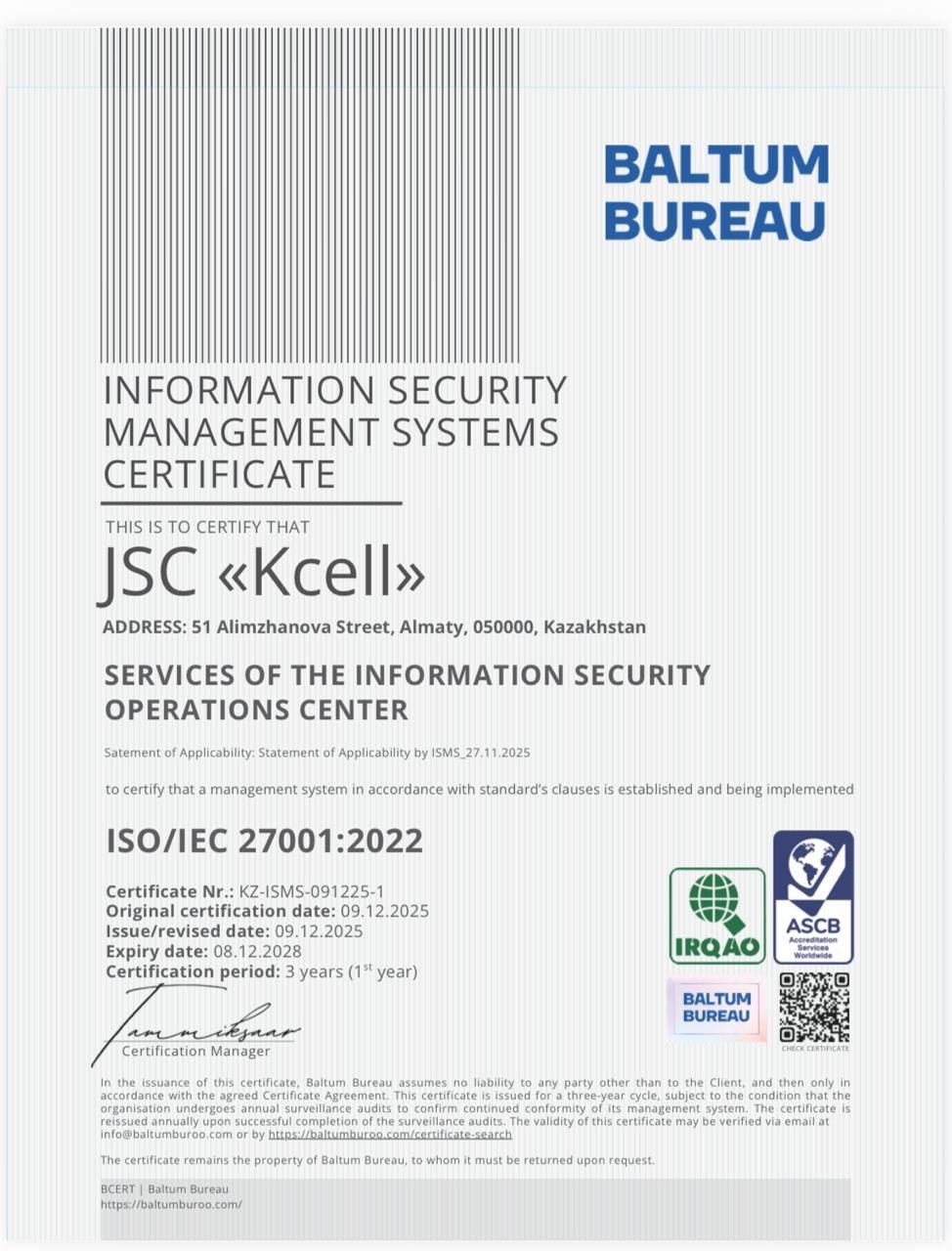 «Кселл» АҚ ақпараттық қауіпсіздікті басқару жүйесін құру, енгізу және жетілдіру үдерістерін реттейтін әлемдік жетекші стандарт - ISO/IEC 27001:2022 халықаралық сертификатын алды.
