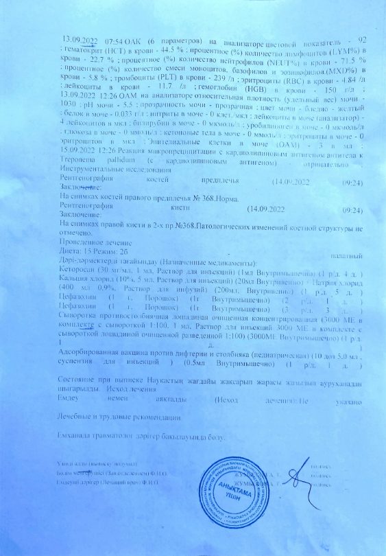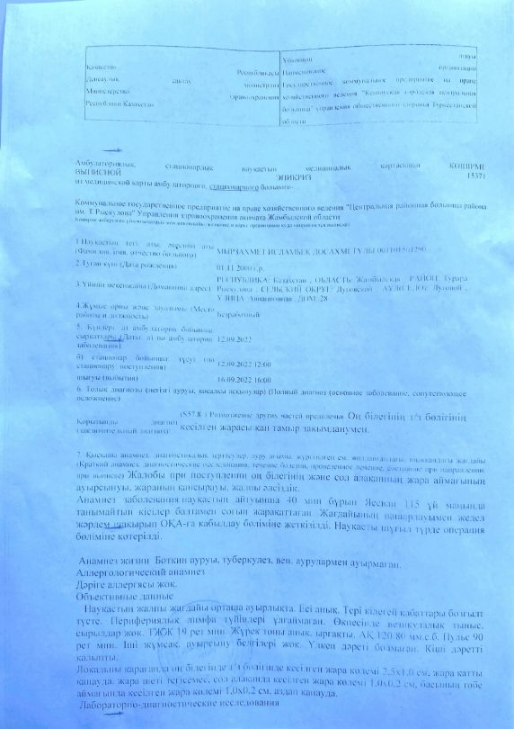 Қалалық аурухананың медициналық анықтамасына қарағанда, Исламбек Мырзахметтің оң білегі кесіліп, қан тамыры зақымданған. Бірақ онда басы, арқасы мен аяқ-қолындағы жарақаты көрсетілмеген.