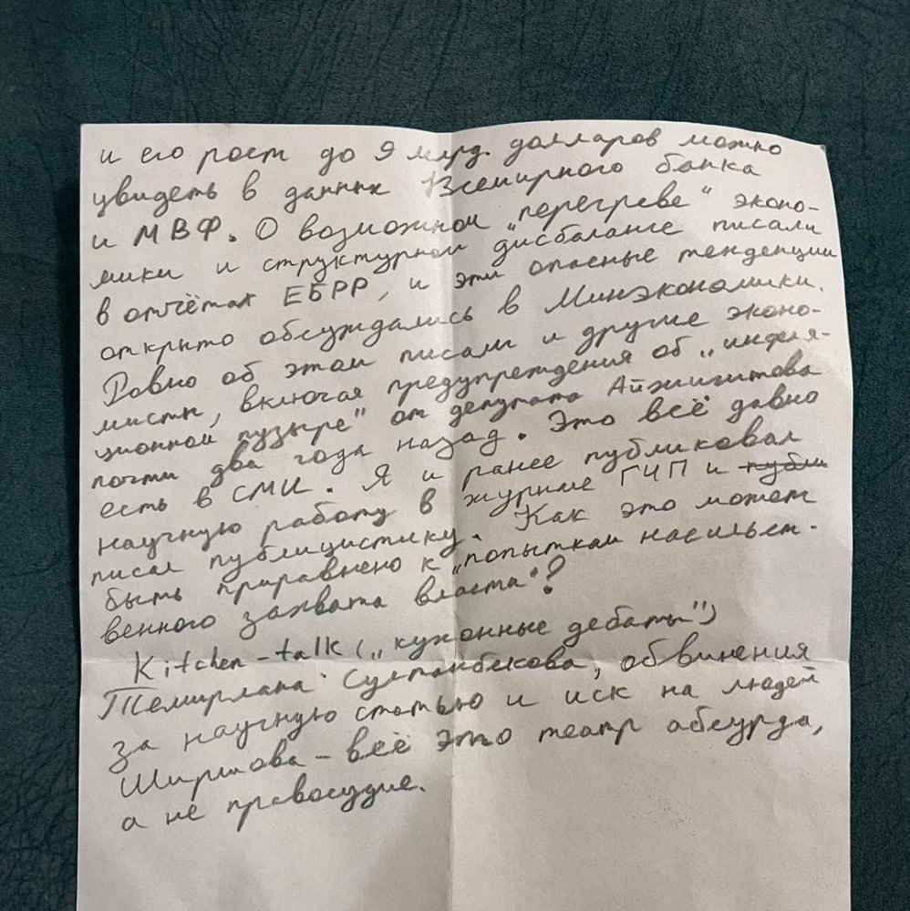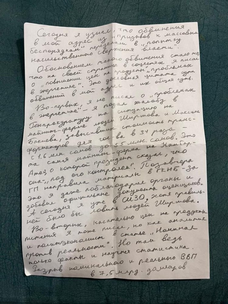 «Мұндай айып тағудың себебі — әлеуметтік желідегі парақшамда азық-түлік бағасының қымбаттауы мен энергетика саласындағы мәселелер жөнінде жазғаным», – дейді ол.