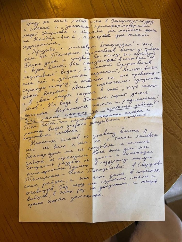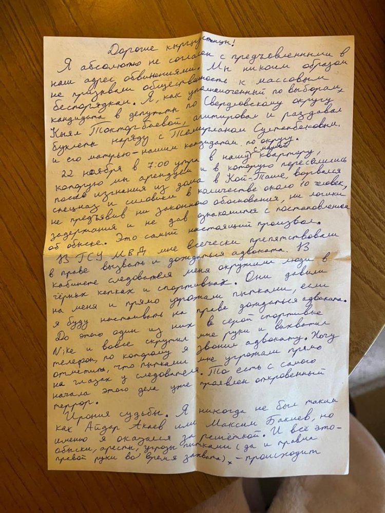 Kaktus.media дерегінше, Қадырбек Атамбаев 22 қарашада жазған хатында өзі де, серіктестері де ешкімді жаппай тәртіпсіздікке шақырып, үндеу жасамағанын, тек Свердлов округінде депутаттыққа кандидат Қыял Тоқторбаеваны қолдап, үгіт-насихат жүргізгенін айтады.