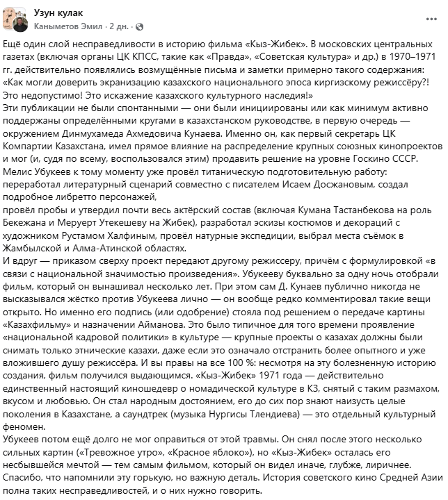 Қазақтың ең көркем жырларының бірі «Қыз Жібек» екені анық. Жақында қырғыз профессоры Эмиль Каниметов сол кезде режиссер Мелис Убукеевтің фильм үшін еңбек етіп, режиссері бола алмай қалғанын айтып, жазба жариялады, деп хабарлайды Orda.kz.