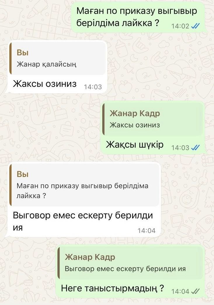 «Жастар орталығы қаламыздың жастар мәселесін шешеді дегенге сеніңкіремейтін едік, енді лайк басқан-баспаған қызметкерлерін тізіп, тексеріп, өздері хатта жазғандай «ескерту» жасап, жұмыс істеуге кедергі келтіріп жүрсе... Бұл іс түбі оңбайды.. Бүгін (16 сәуір – ред.) осындай қысым көре берген орталық қызметкерінің мазасы қашып, құлап қалып, жедел-жәрдем шақырып, алғашқы медициналық көмекке жүгінуіне тура келді!» деп жазып, жергілікті әкімдіктерді белгілеп, осы мәселеге назар аударуды сұрады