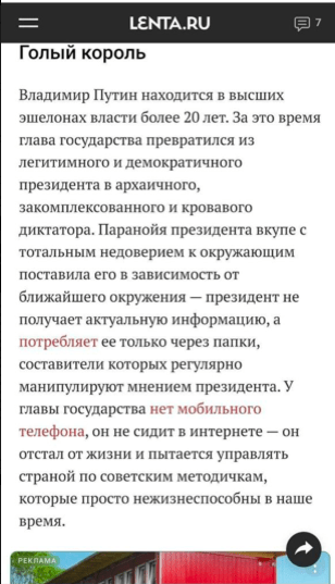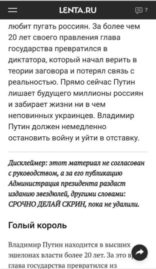 «Путин 21 ғасырдағы қанды соғыстардың бірін бастады», «Владимир Путин аянышты диктаторға және параноидқа айналды», «Ресей элитасы непотизммен және сикопанизммен ауырады» тақырыбындағы жаңалықтар, сондай-ақ, басты мақалада «экономикадағы сәтсіздіктерді жасыру оңайырақ. Путин кетуі керек. Ол мағынасыз соғыс ашты және Ресейді тұңғиыққа батырып жатыр» деген сыни көзқарас сайттан жойылды, бірақ веб-мұрағатта басты беттің көшірмесі сақталған.