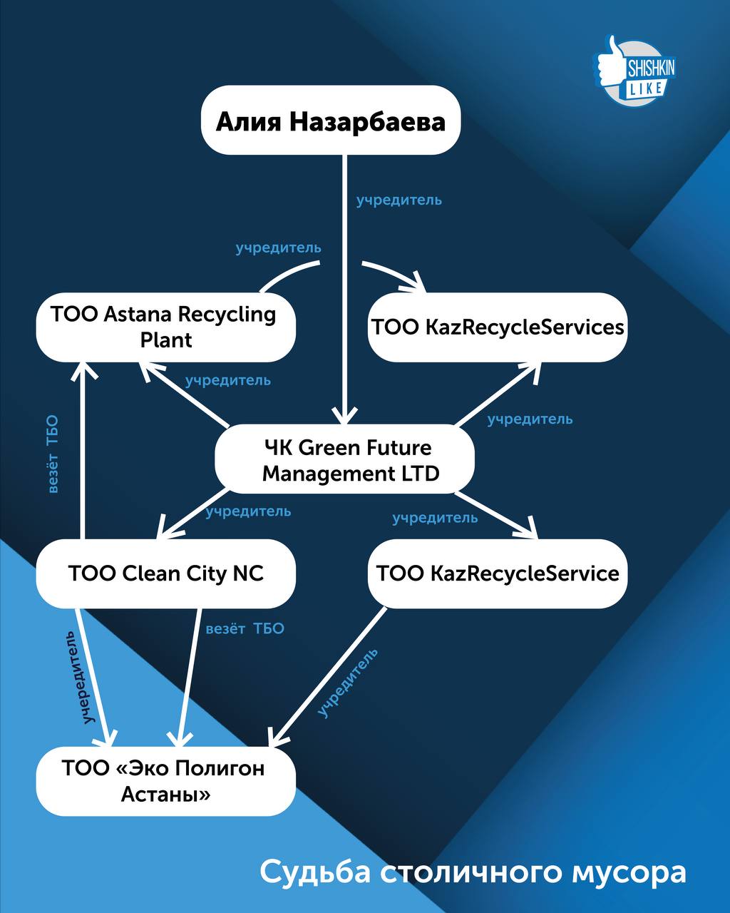Сондай-ақ, Әлия Назарбаеваның Green Future Management LTD жеке компаниясы арқылы. Оның бастапқы құрылтайшысы Светлана Коротенко (қазір тергеуде), оған «Cleancity Shymkent» ЖШС және «Cleancity Aktobe» ЖШС болған «Taza Energy Solutions» ЖШС тиесілі.