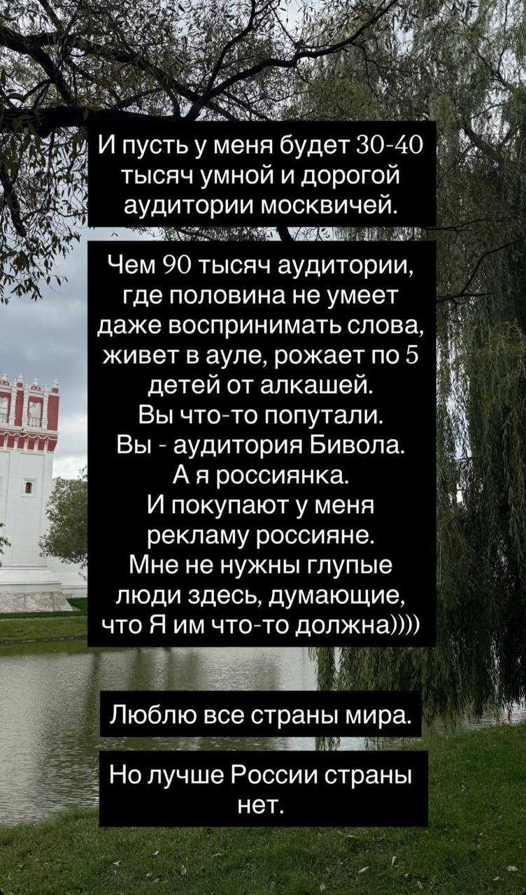 Екатерина Бивол Instagram парақшасында қазақстандық аудиторияны сауатсыз, надан халыққа теңеді. Оның айтуынша, қазақстандықтар тек маскүнемдерден бала табуды ғана біледі.