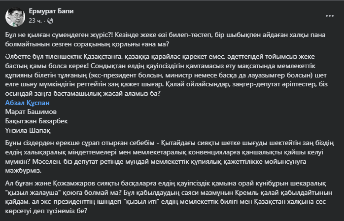 «Бұл не қылған сүмеңдеген жүріс?! Кезінде жеке өзі билеп-төстеп, бір шыбықпен айдаған халқы пана болмайтынын сезген сорақының қорлығы ғана ма? Әлбетте бұл тіленшектік Қазақстанға, қазаққа қарайлас қарекет емес, әдеттегідей тойымсыз жеке бастың қамы болса керек! Сондықтан елдің қауіпсіздігін қамтамасыз ету мақсатында мемлекеттік құпияны білетін тұлғаның шет елге шығу мүмкіндігін реттейтін заң қажет шығар», – деп мәлімдеді Ермұрат Бәпи.