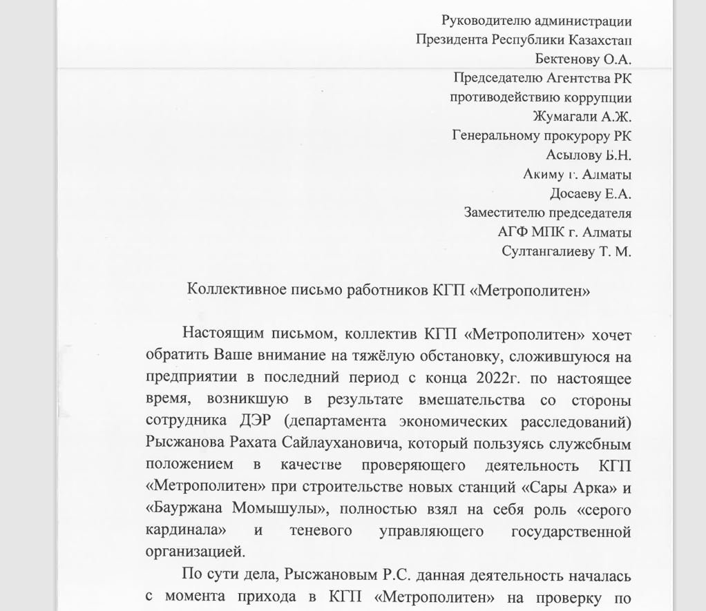 Хатта Экономикалық тергеу департаментінің (ЭТД) қызметкері Рахат Рысжанов жаңа «Сары Арқа» және «Момышұлы» метро стансаларының құрылысын тексеру қызметін пайдаланып, метро басшылығын өзіне тәуелді етіп алғаны айтылған. Ал метродағылар Рысжановтың жақындары мен таныстарын маңызды қызметтерге орналастыра бастаған. Олардың көпшілігі біліктілік талаптарына сай емес және бұл салада тәжірибесі де жоқ.