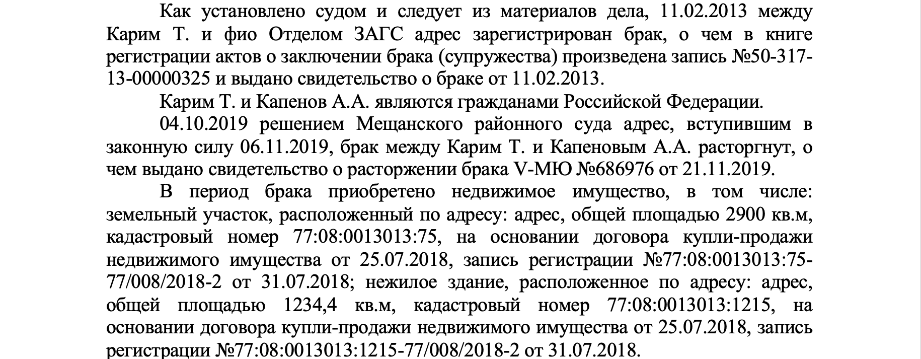 Жылжымайтын мүлікті бөлу туралы келісім нотариуста рәсімделмегенімен, консулдық қызметкерлерінің көзінше қол қойылғандықтан, сот оны заңды деп таныды. Осыған байланысты Тамиланың Қапенов жасаған мәмілелерді жарамсыз деп тану және элиталық үй мен жерден үлес алу жөніндегі талаптары қанағаттандырылмады.