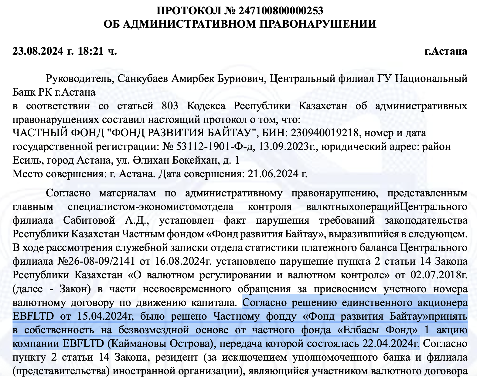 Бұл айыппұлды ҚР Ұлттық банкі салған. Бұзушылық туралы хаттамада 2024 жылы 22 сәуірде Нұрсұлтан Назарбаевтың «Елбасы» қоры Назарбаевтың тағы бір «Байтау» атты даму қорына Кайман аралдарында тіркелген, яғни офшор аймағындағы EBF LTD компаниясының бір акциясын бергені жазылған. Сондай-ақ құжатта бұл шешімді EBF LTD-нің жалғыз құрылтайшысы 2024 жылы 15 сәуірде қабылдағаны көрсетілген. Бірақ ол құрылтайшының кім екені беймәлім.