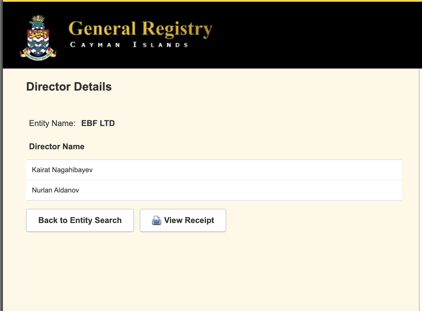Ұлттық банк біздің ресми сауалымызға нақты жауап бермей, бұл тақырып монетар реттеушісінің құзыретіне кірмейді деп сылтауратты. Сондықтан біз Каймандағы компаниялардың жалпы тізімін қарап шықтық. Бұл компанияны сол жерден компанияны таптық. Реестрден алынған үзінділер арқылы біз оның кеңсесінің мекенжайын, бар-жоғы 49,5 мың доллар болатын жарғы капиталын және екі директордың аты-жөнін білдік. Олар: Қайрат Нағашыбаев пен Нұрлан Алданов.