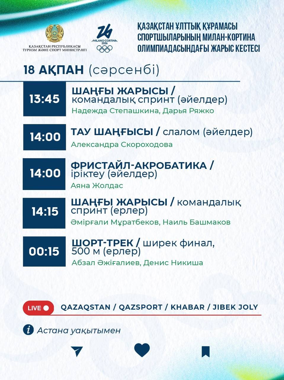 Милан және Кортина-д'Ампеццодағы қысқы Олимпиададағы 18 ақпан күні өтетін жарыс кестесі: