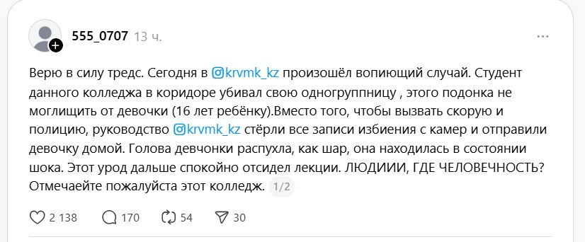 Ақпаратты threads-ке @555_0707 қолданушысы тарата бастады. Біздің білуімізше, ол колледж студенті де емес.