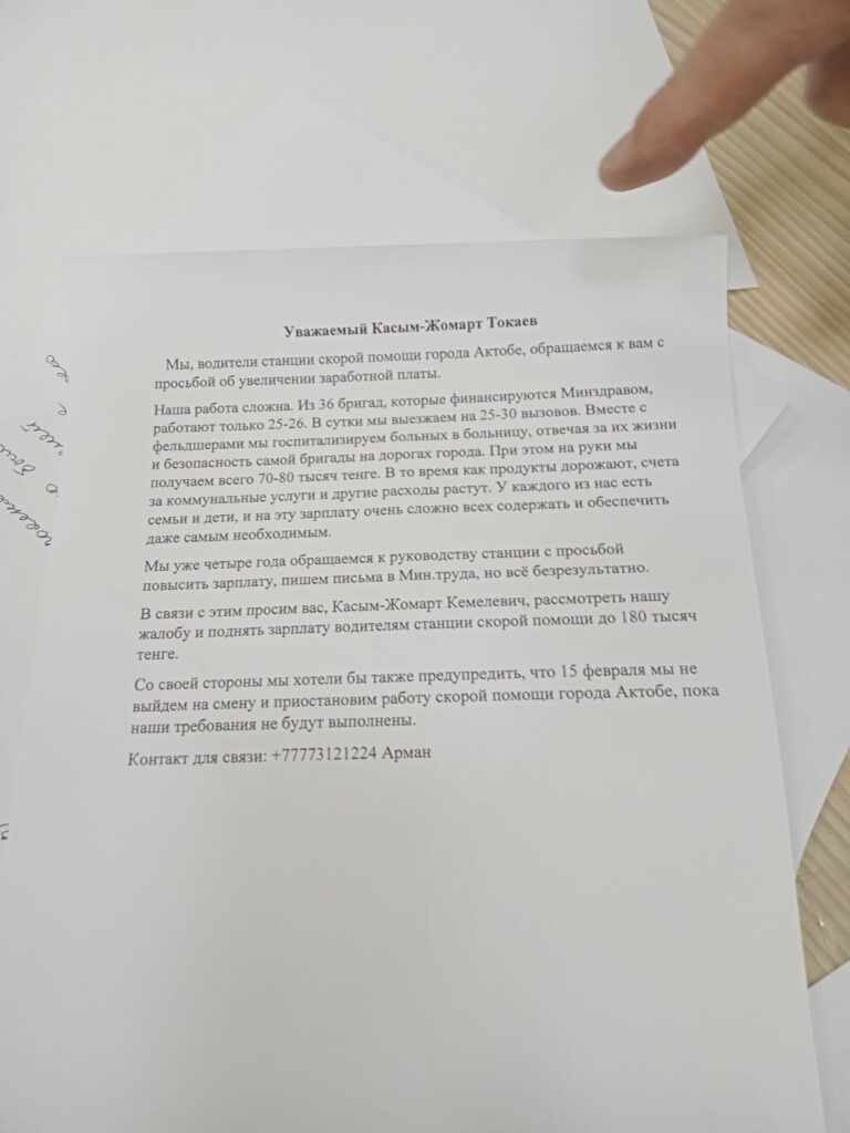 Ақтөбеде жедел жәрдем қызметінің жүргізушілері жалақы көтеруді сұрайды. Қазақстан президентінен көмек сұраған наразы тарап 15 ақпанға дейін мәселе шешілмесе жұмысты тоқтататынын айтып талап қойды.
