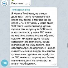 - Мен Жанна Тоқбаева, шын мәнінде 270 теңге тұратын 1 литр алмұрт шайы онда 500 теңге тұрады. Сол күні менде 900 теңгем ғана болды. Қызым 500 теңгеге ойыншық сатып алды, балам су ішкісі келді. 100 теңге жетпей тұрды. Мен шырынды қайтармақшы болғанда қызым жылай бастады, сосын мен одан неге қымбат екенін сұрадым. Сатушы «аренда қымбат» деп жауап беріп, бірден мені видеоға түсіре бастады. Саябақта аналар балаларымен жүреді. Шынымен қымбат. Кішкентайлар ештеңе түсінбей жылай бастайды.