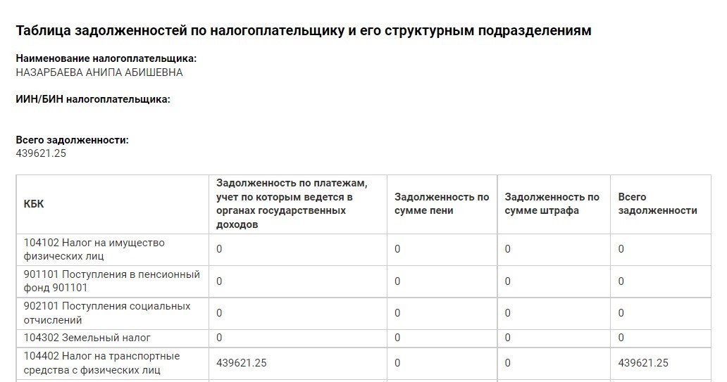 Қазақстанның тұңғыш президентінің қарындасы Әнипа Назарбаева салық жағынан ең көп қарыздар адам. Мемлекеттік кірістер комитетінің мәліметінше, ол қазынаға 439 621,25 теңге төлемеген. Құжаттарда қарыз сомасы Алматы қаласы Бостандық ауданы бойынша Мемлекеттік кірістер басқармасында тіркелген көлік салығы екені көрсетілген.