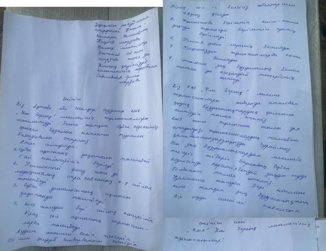 «Жалақымыз үнемі 1-1,5 ай кешігіп түседі. Зейнетақы қорына және медициналық сақтандыруға 7-8 айлап ақша аударылмайды. Еңбек демалысының ақшасын уақытында алмаймыз. 2019 жылы жалақы көтерілді. Бірақ сол ақша жұмысшыларға төленбеді. Аудит тексеріс жүргізді. 190 млн теңге болатын заң бұзушылық жасағанын естідік. Бірақ белгісіз себептермен аяқсыз қалды. Жұмысшыларға зиянды жұмыс үшін сүт, киім берілмейді. Кәсіподақ тарапынан көмек жоқ. Біз көп жылдар бойы жасалып келген заң бұзушылықтарды қалпына келтіруді сұраймыз. Мекемеге тексеріс жіберілсін», — деді жұмысшылар үндеуде.