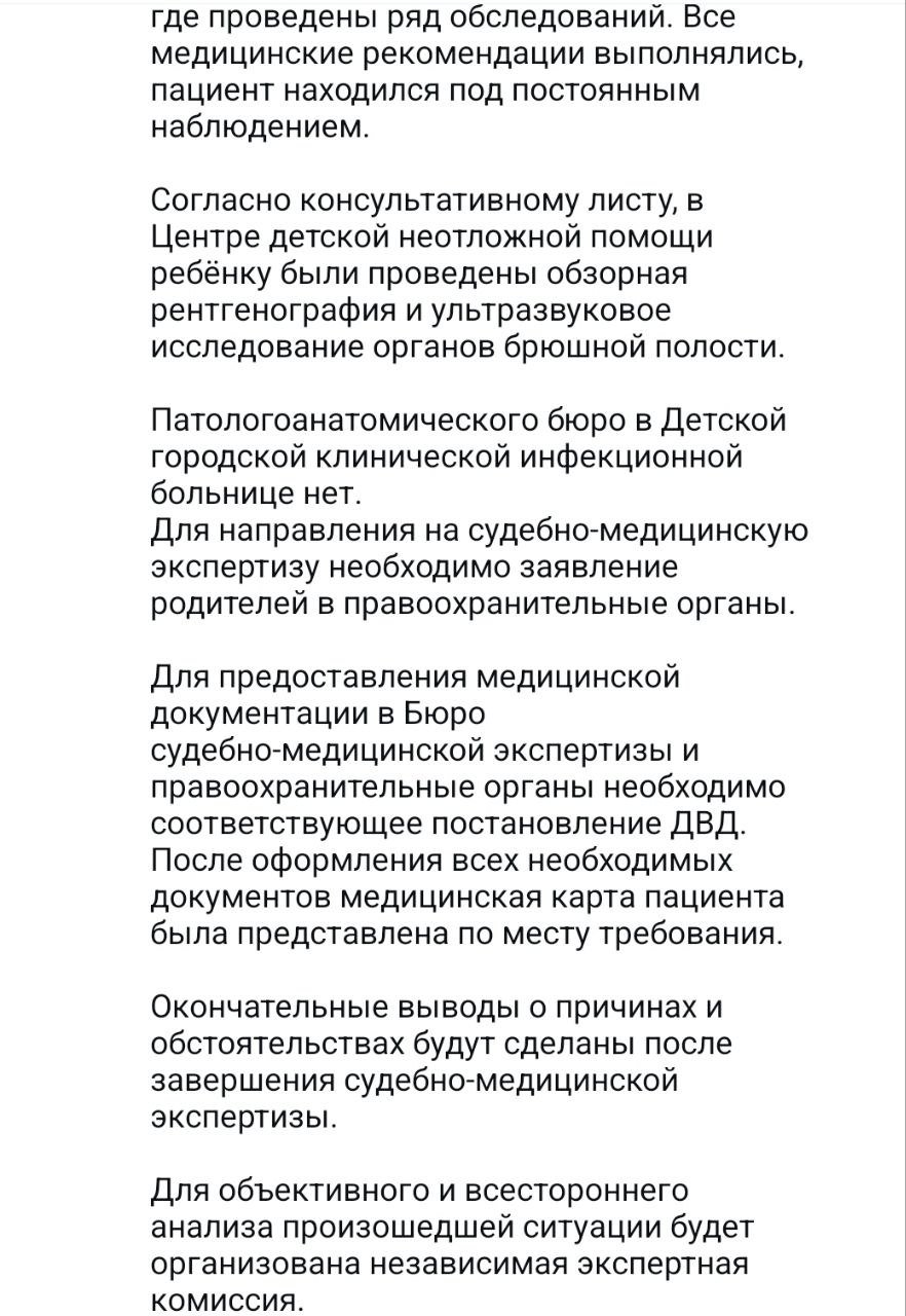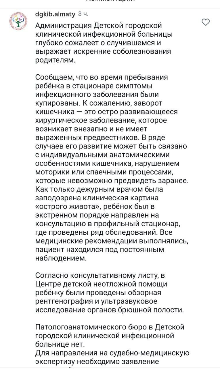 «Балалар қалалық клиникалық жұқпалы аурулар ауруханасының әкімшілігі болған оқиғаға қатты өкінеді және ата-аналарға қайғыра көңіл айтады», – деп мәлімдеді әкімшілік.