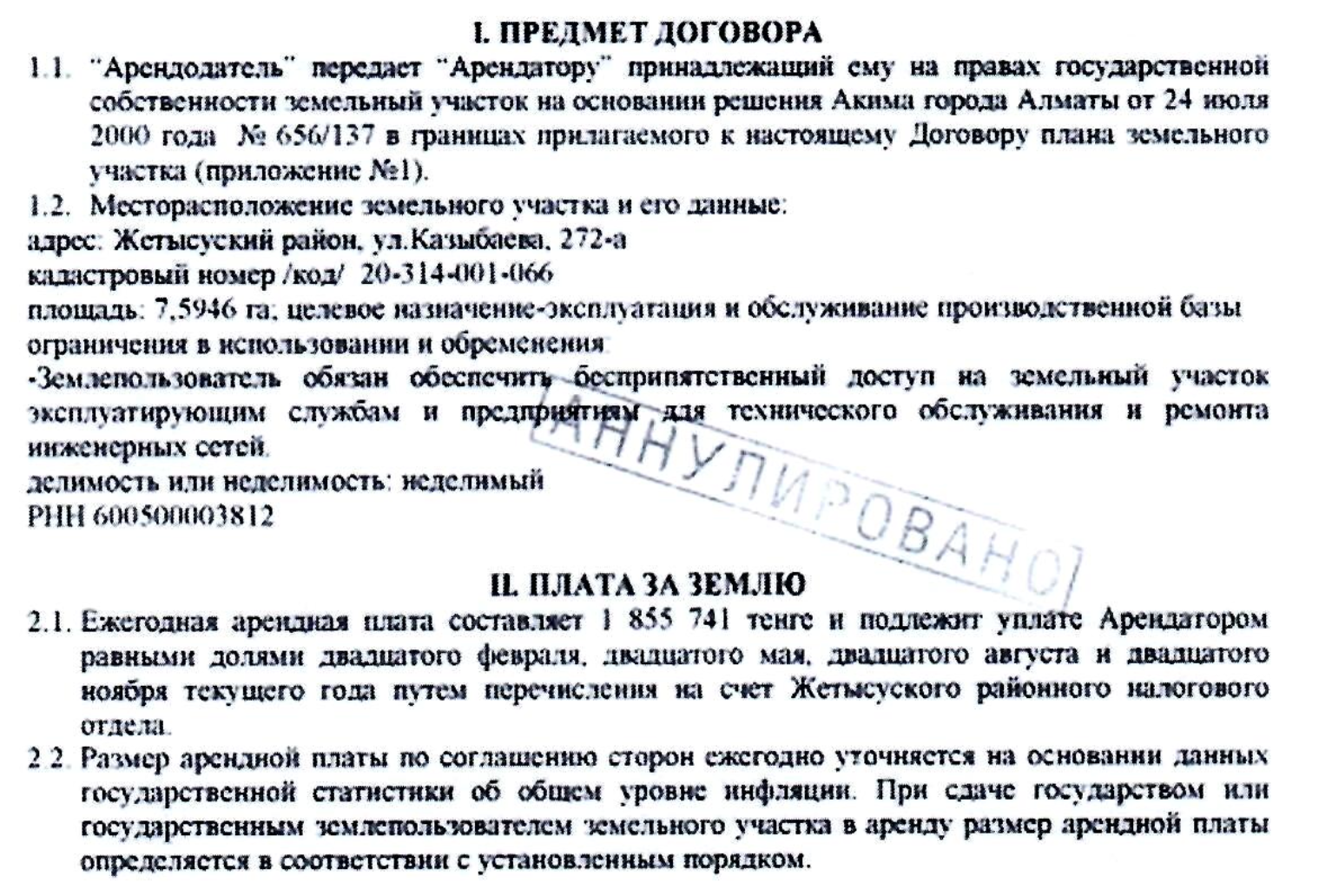 Бұдан бөлек, 2000 жылы «Серт» АҚ бұл жер учаскесін әкімдіктен жылына небәрі 1,8 млн теңгеге жалға алған. Келісімнің әрекет етуші мерзімі 2003 жылдың қырқүйегіне дейін болған, кейін зауыт өндірістік базасы Ермегияевтің иелігіне өткен. Осы мәмілені сол кезде Алматы әкімі Иманғали Тасмағамбетов бекіткені хаттамада көрсетілген.