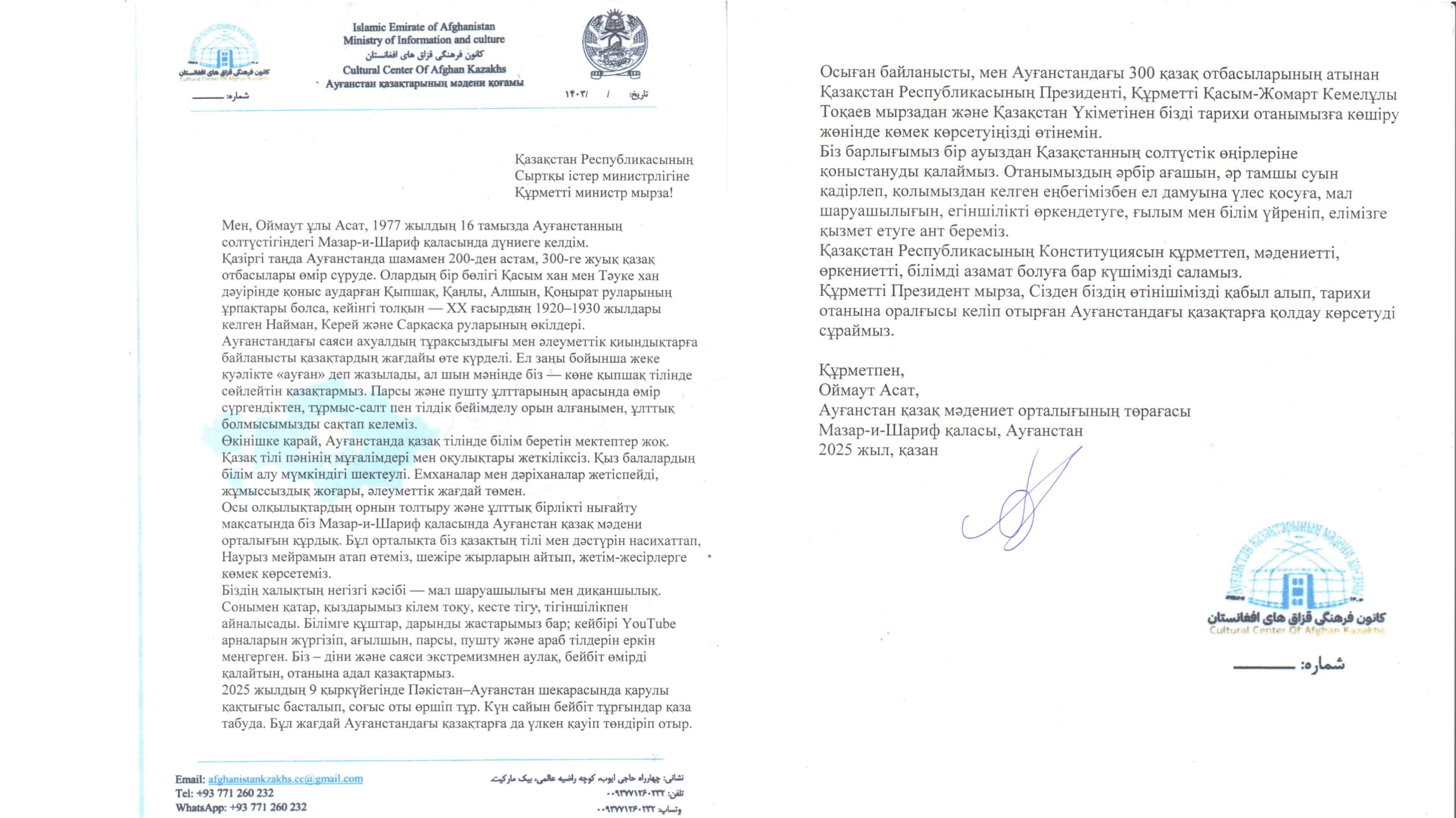 «2025 жылдың 9 қыркүйегінде Пәкістан-Ауғанстан шекарасында қарулы қақтығыс басталып, соғыс оты өршіп тұр. Күн сайын бейбіт тұрғындар қаза тауып жатыр. Бұл жағдай Ауғанстандағы қазақтарға да үлкен қауіп төндіріп отыр. Осыған байланысты, мен Ауғанстандағы 300 қазақ отбасыларының атынан Қазақстан Республикасының Президенті, Құрметті Қасым-Жомарт Кемелұлы Тоқаев мырзадан және Қазақстан Үкіметінен бізді тарихи отанымызға көшіру жөнінде көмек көрсетуіңізді өтінемін. Біз барлығымыз бір ауыздан Қазақстанның солтүстік өңірлеріне қоныстануды қалаймыз», — деді Ауғанстан қазақ мәдениет орталығының төрағасы Оймаут Асат.