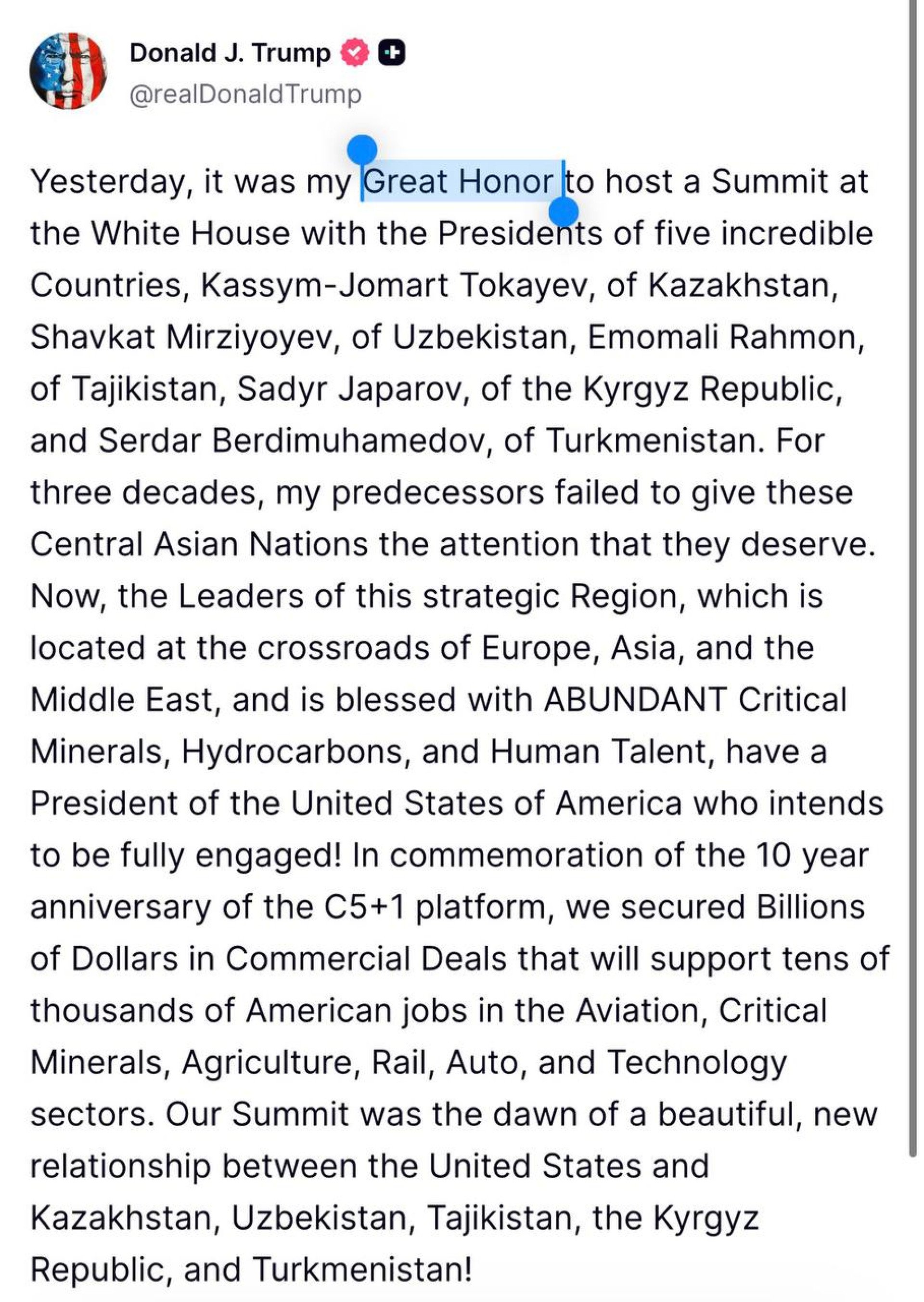 «С5+1 платформасының 10 жылдығы құрметіне біз миллиардтаған долларға коммерциялық мәмілелер жасадық, олар авиация, минералдар, ауыл шаруашылығы, темір жол, автомобиль жасау және технология секторындағы он мыңдаған америкалық жұмыс орындарын қолдайды. Біздің саммит Құрама Штаттар мен Қазақстан, Өзбекстан, Тәжікстан, Қырғыз Республикасы мен Түрікменстан арасындағы тамаша қарым-қатынастарға жаңа серпін береді», - деп түйіндеді ол.