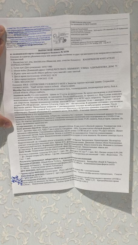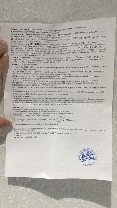 №2 Астана қалалық ауруханасының медициналық анықтамасында Жақыпбековке «бас ми жарақаты» деген диагноз қойған. Ауруханада түскен кезде «әлсіздік, ауырсыну, бас айналуы, лоқсу» болған.