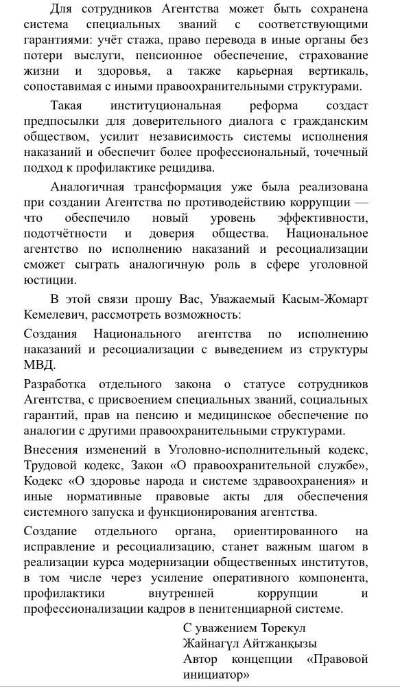 — Меніңше, жаңа агенттік қызметкерлерінің мәртебесі туралы жеке заң қабылдап, Қылмыстық-атқару кодексіне, «Құқық қорғау қызметі туралы» заңға, «Халық денсаулығы және денсаулық сақтау жүйесі туралы» кодекске және Еңбек кодексіне өзгерістер енгізу керек. Бұл соған тұрарлық іс!