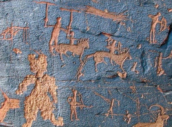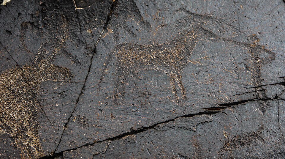 Бұл аймақтағы жартас суреттері қола дәуірінен бастап орта ғасырларға дейінгі кезеңдерді қамтиды. Аң аулау көріністерінде адамдармен бірге жүрген жеңіл денелі, жүйрік иттер бейнеленген. Олардың дене бітімі қазіргі тазыларға ұқсас деп сипатталады.