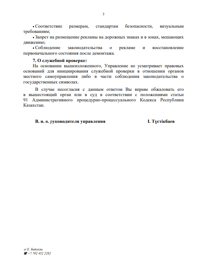 Редакция бильборд кімнің бастамасымен орнатылғаны туралы және рұқсат қағаздары мен төлем құжаттары туралы сауалнамаға қосқан болатын. Өйткені баннерде заң талап ететін бірде-бір міндетті реквизит көрсетілмеген.