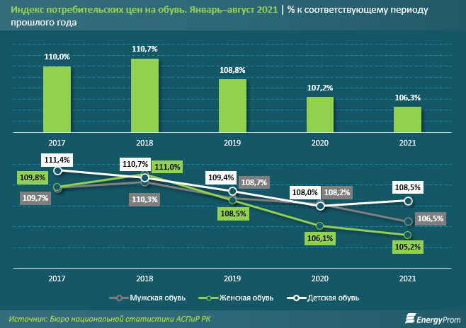 2021 жылы ерлер аяқ-киімі 6,5%, әйелдер аяқ-киімі 5,2%, ал балалар аяқ-киімі 8,5%-ға қымбаттады.
