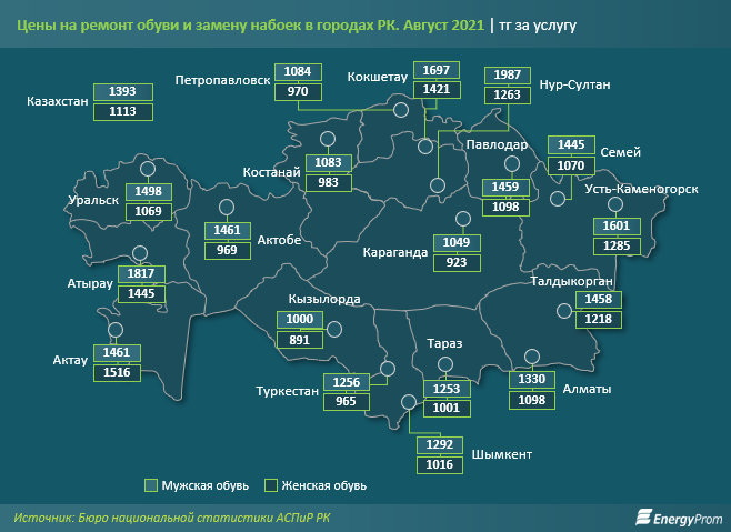 Тамызда Қазақстан қалаларында ерлер аяқ-киімін жөндеуге орташа шығын 1393 теңге, ал әйелдер аяқ-киімі 1113 теңге болды.